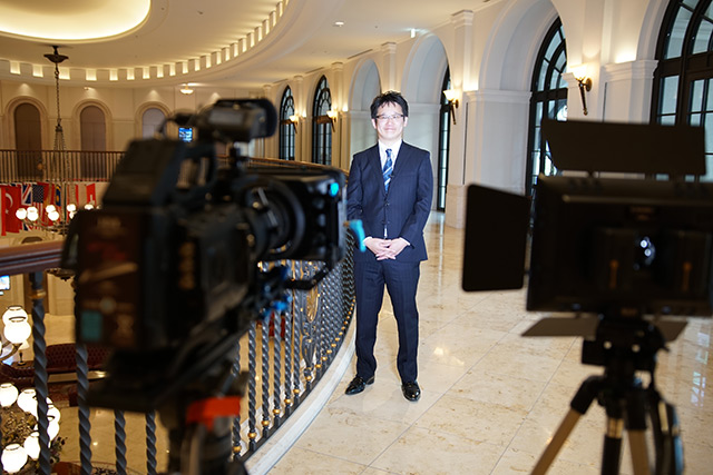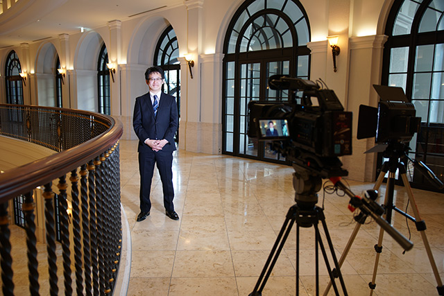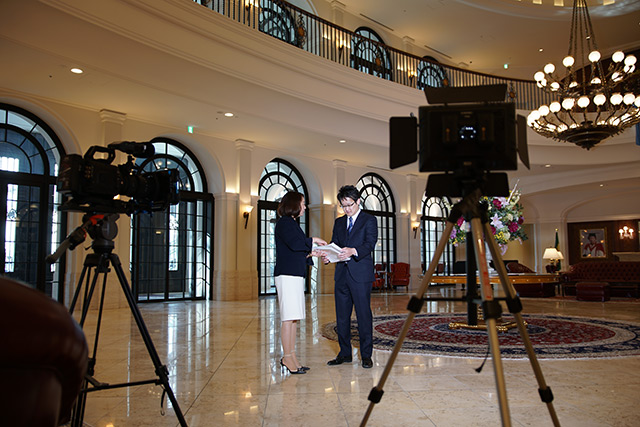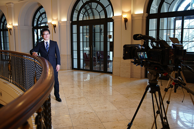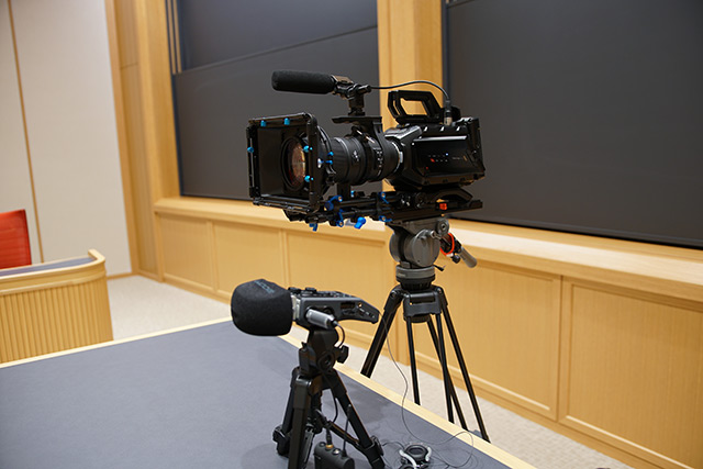 撮影後にブラックマジック社の機材で構成されたNUCB Business Schoolホールの映像システムを理事長にご案内頂きました。